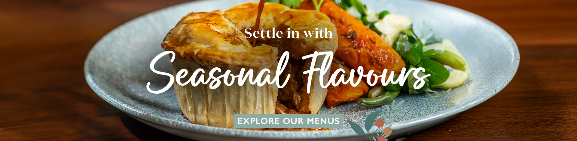 Cosy up to comforting country pub classics or new seasonal delights, like our Slow-Cooked Beef Shin, fresh Salmon Fillet served in a creamy white wine & king prawn sauce, or stone-baked Korean Pulled Beef Pizza. Then, indulge in a Sticky Toffee Pudding by flickering log fires.